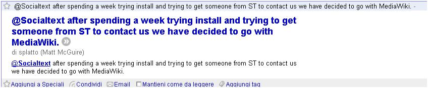 Nelle ultime settimane, fra i tanti argomenti, mi sto interessando al wiki professionale Socialtext e quindi l’ho subito messo sotto osservazione e, come sta succedendo sempre più spesso, anche le aziende controllano la timeline per carpire – da un canale come Twitter – tutto ciò che li può in qualche modo riguardare.