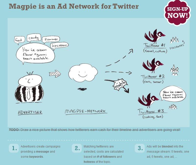 Magpie è un nuovo servizio che dopo un certo numero di nostre twitterate inserisce nella timeline un messaggio pubblicitario che, un pò come Google AdSense, assumerà un certo valore in funzione del numero dei follower e determinando il compenso per il sottoscrittore del servizio.