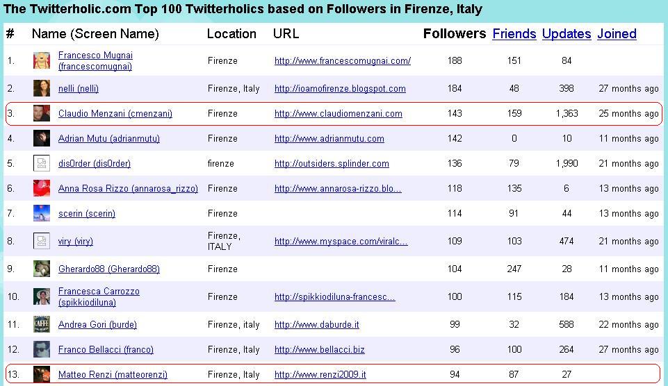 Personalmente mi piazzo fra il secondo ed il terzo posto, ma quello che più interessante è la recente presenza su twitter di Matteo Renzi vincitore delle primarie e quindi candidato a Sindaco di Firenze per il PD che attualmente occupa una “onorevole” tredicesima posizione, ma che sono pronto a scommettere nei prossimi giorni balzerà in testa alla classifica.