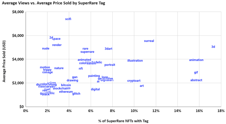 Le opere con oltre 500 visualizzazioni sono dominate da tag relativi al nome dell’artista, il che implica che l’hype che circonda i singoli artisti, così come il loro tempo di presenza sulla piattaforma, è responsabile dell’aumento dei prezzi. Gli artisti più visti sono Hackatao, XCOPY, Pak, Coldie e Robbie Barrat, che insieme rappresentano 116.544 visualizzazioni totali o il 7,7% di tutte le visualizzazioni su SuperRare nonostante producano solo il 3,8% degli NFT di SuperRare.
